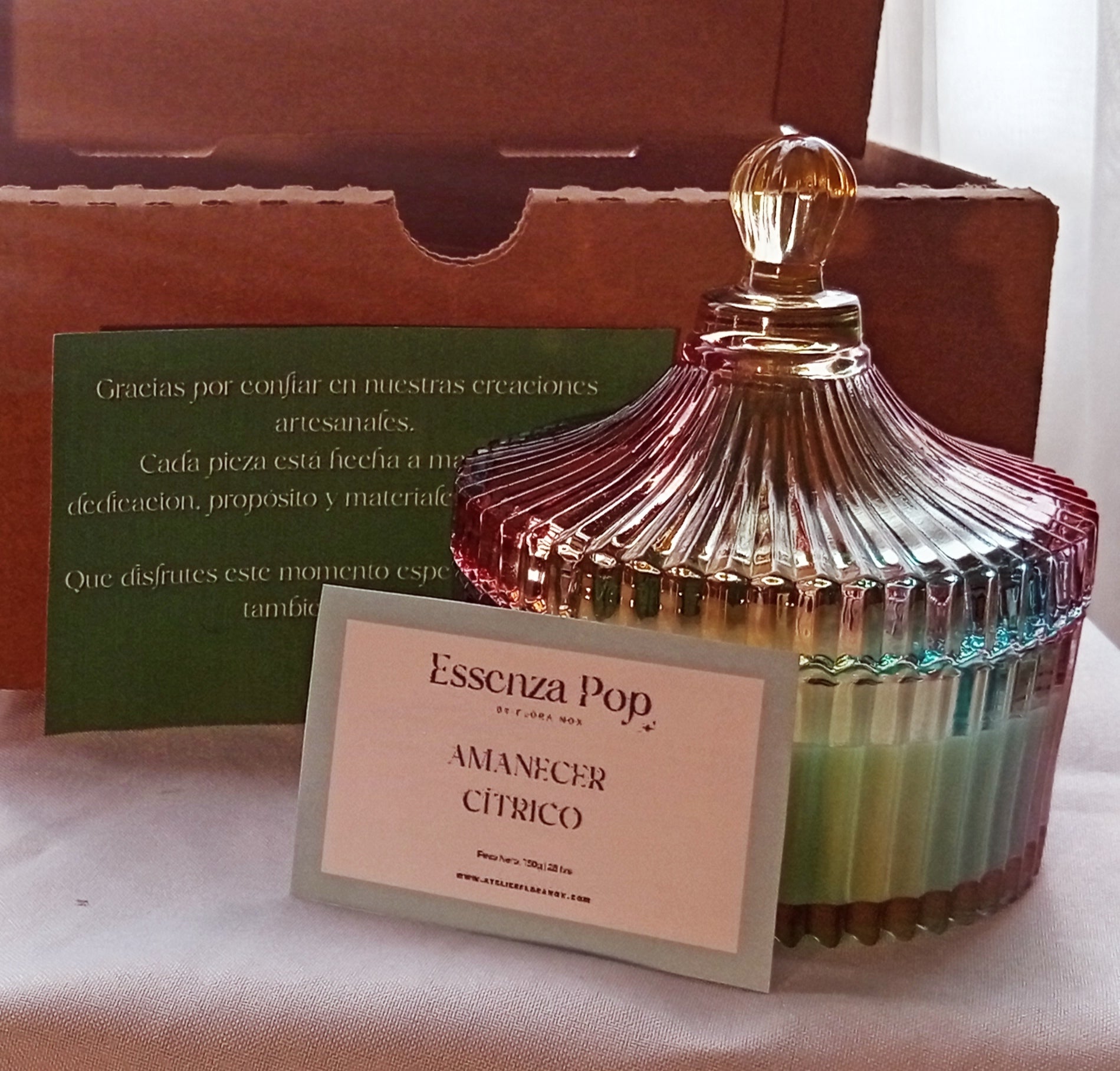 Su diseño en frasco de vidrio y su quemado parejo la convierten en una pieza funcional y decorativa, perfecta para regalar o disfrutar a diario.